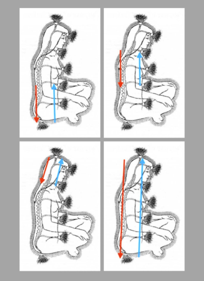 1. Phase, Teil 1: Beginnend beim unteren Energiekreislauf wanderst du innerlich während des Einatmens Lendenwirbel, Kreuzbein, Steißbein abwärts und lässt die untere Wirbelsäule aufleuchten (sofern du es visualisieren kannst, es funktioniert auch ohne), beim Ausatmen gehst du innerlich die unteren drei Chakras, Muladhara, Svadhisthana, Manipura aufwärts und lässt auch sie der Reihe nach aufleuchten. Atme langsam und vollständig ein und aus. Die Pausen zwischen Ein- und Ausatmung und zwischen Aus- und Einatmung sind so lang, wie es dir angenehm ist. Übe auf diese Weise etwa 2-3 Minuten (mit zunehmender Übung kannst du es steigern). Mache danach eine kleine Pause, lasse den Atem wieder ganz natürlich fließen. Nimm den unteren Wirbelsäulenbereich wahr und die unteren drei Chakras.