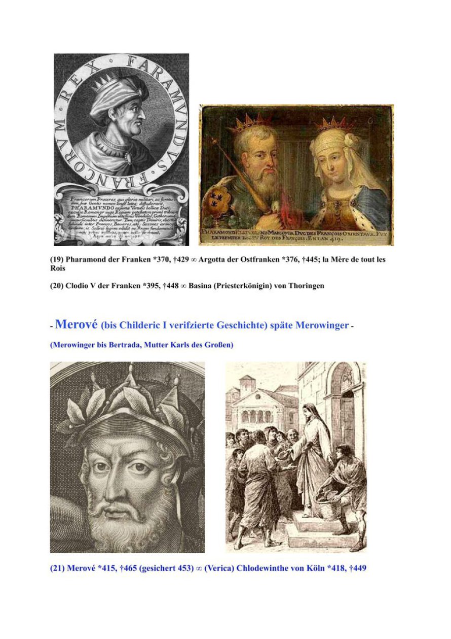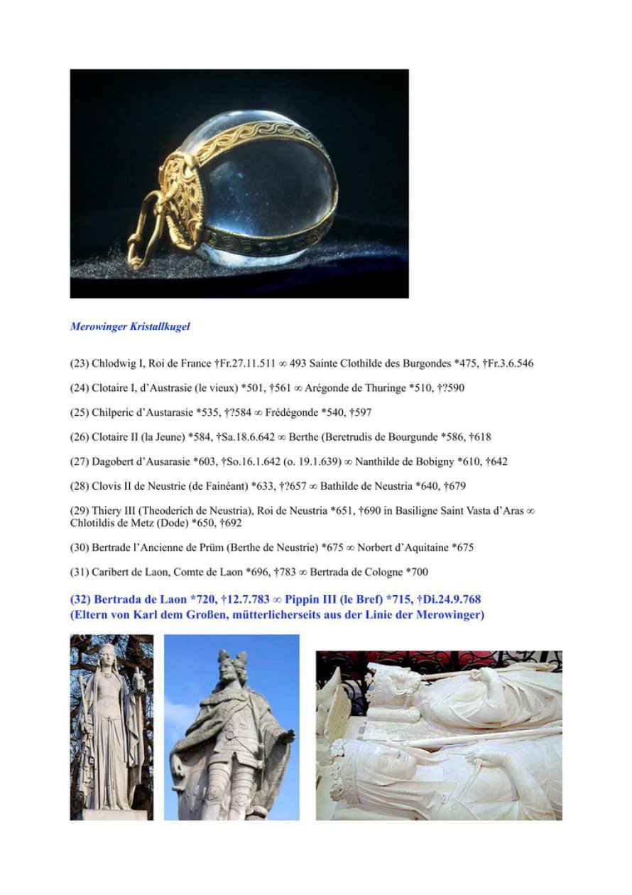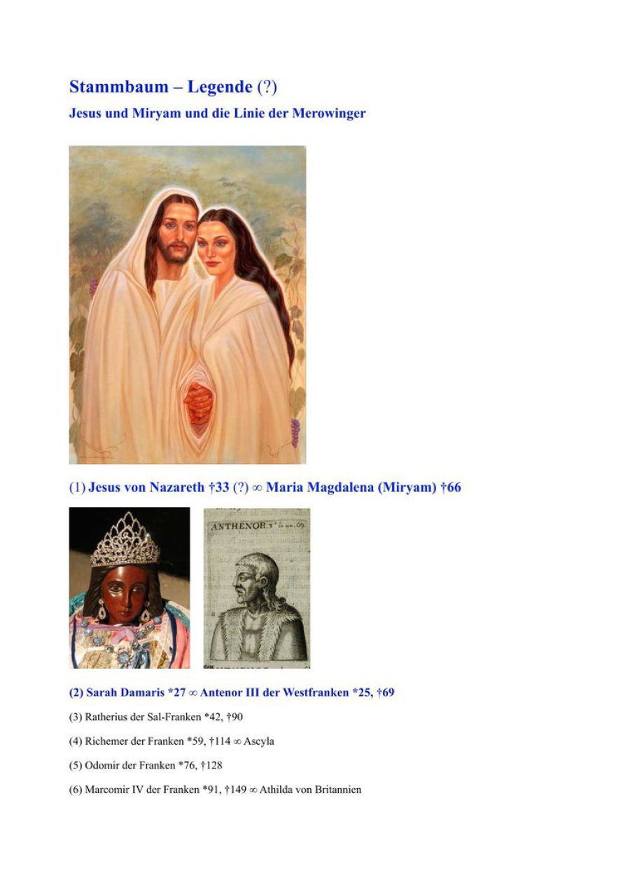 Diese meine Ahnentafel mag auf den ersten Blick legendenhaft erscheinen. Der Beginn kann vielleicht Legende sein, obgleich ich selbst an deren Wahrhaftigkeit glaube. Als ich die Statue von Sarah Damaris zum ersten Mal erblickte, war ich überwältigt und erkannte mit allen Fasern die Verwandtschaft und die Wahrheit von Jesu tatsächlicher Geschichte. Ab dem Merowinger-König Childeric I. (*435 n. Chr.) ist diese Tafel geschichtlich verifiziert. Den größten Teil der Ergforschung unserer Familiengeschichte verdanke ich meinem Großonkel, Pfarrer Prof. h. c. Karl Ludwig Rug, der Genealoge war und Zugang zu den Kirchenbüchern und den relevanten Archiven hatte. Seit meiner Kindheit war ich mit seinen Arbeiten vertraut. Später trugen meine eigenen Forschungen einen kleinen Teil dazu bei. Da ich einer sogenannten Bürgermeister-Dynastie entstamme, die urkundlich bis zum Jahr 1293 zurückgeht, sind viele Unterlagen wie auch unser Familienwappen erhalten geblieben.