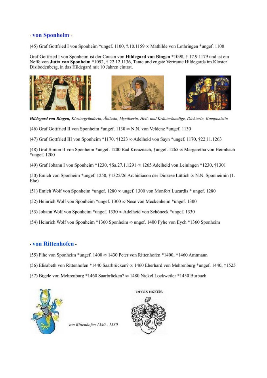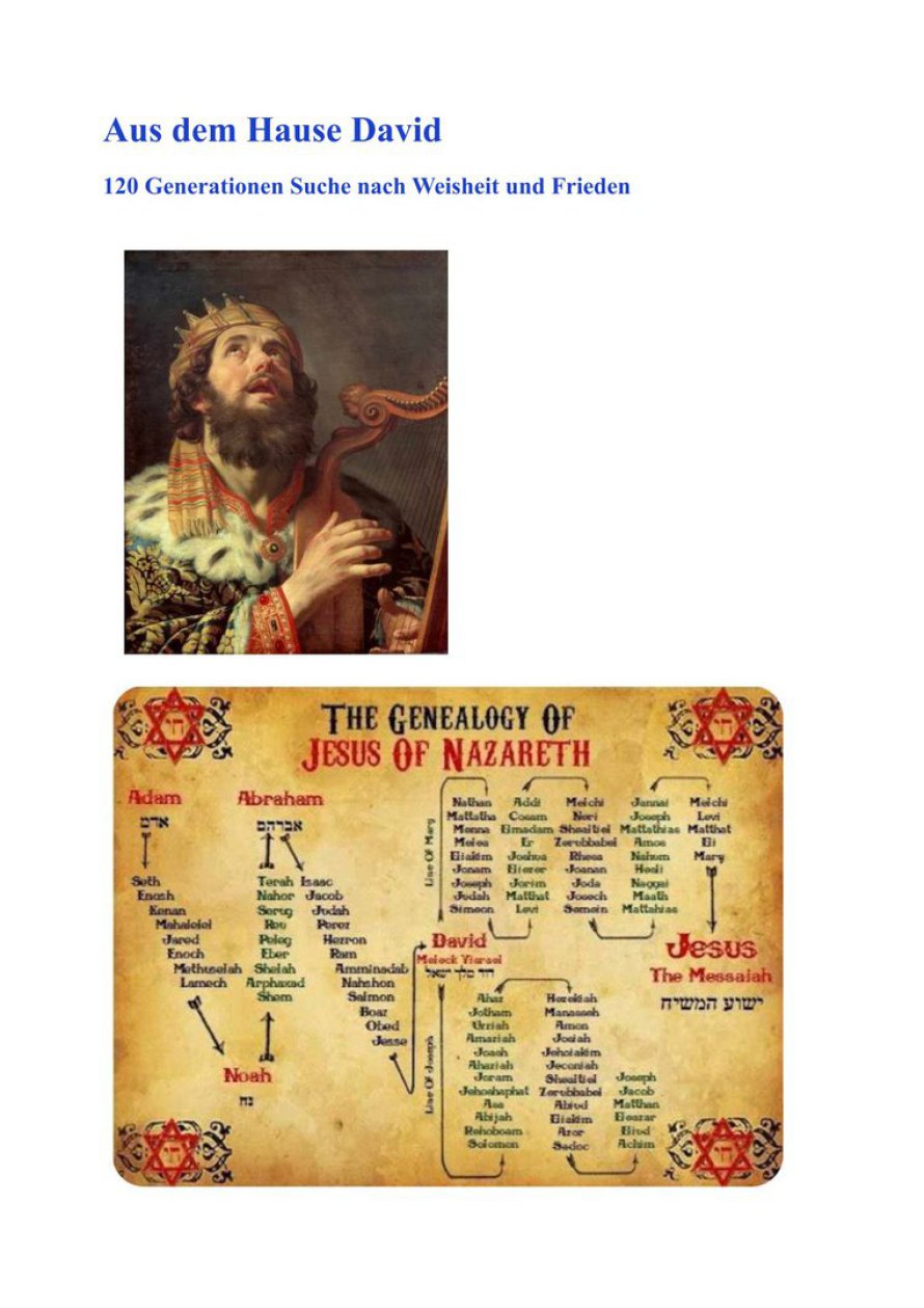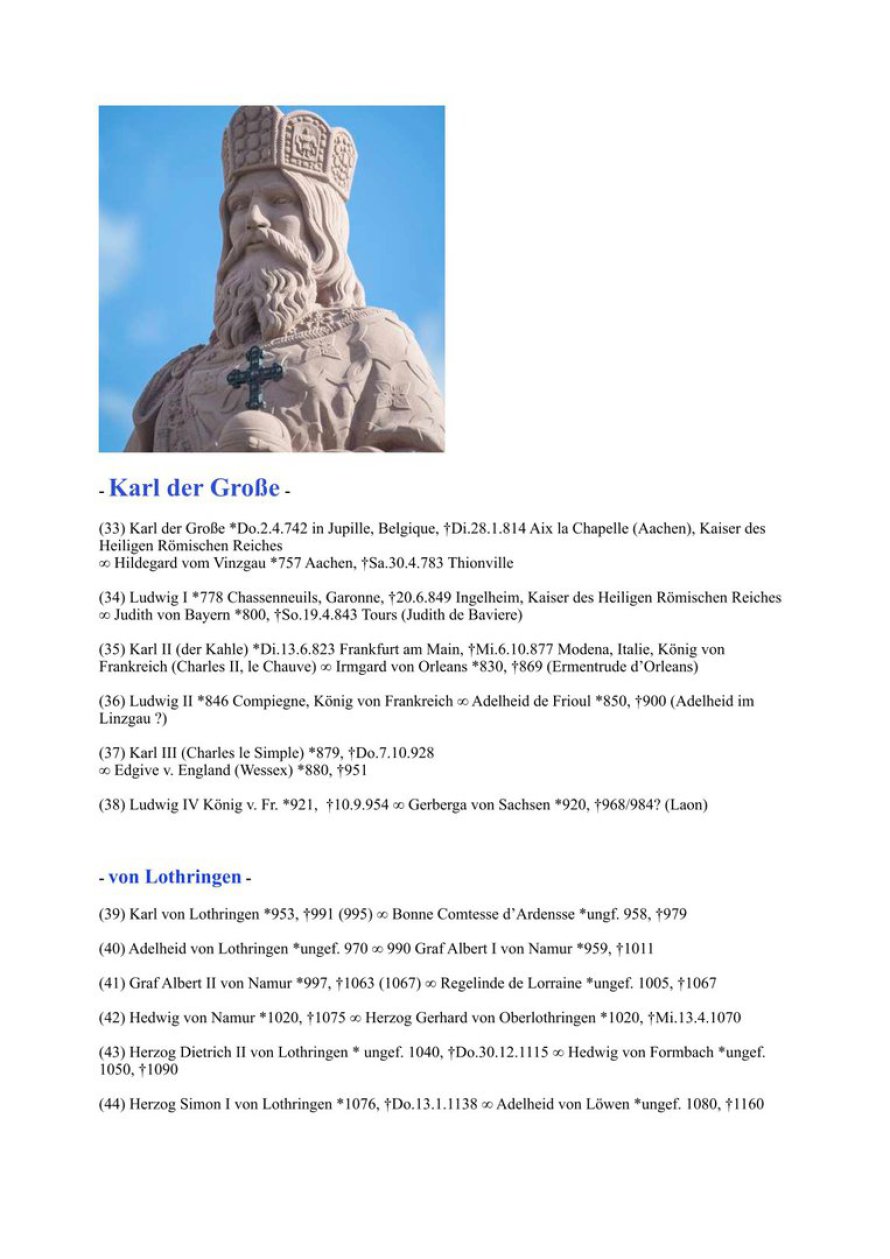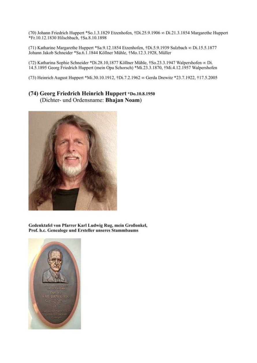 Diese meine Ahnentafel mag auf den ersten Blick legendenhaft erscheinen. Der Beginn kann vielleicht Legende sein, obgleich ich selbst an deren Wahrhaftigkeit glaube. Als ich die Statue von Sarah Damaris zum ersten Mal erblickte, war ich überwältigt und erkannte mit allen Fasern die Verwandtschaft und die Wahrheit von Jesu tatsächlicher Geschichte. Ab dem Merowinger-König Childeric I. (*435 n. Chr.) ist diese Tafel geschichtlich verifiziert. Den größten Teil der Ergforschung unserer Familiengeschichte verdanke ich meinem Großonkel, Pfarrer Prof. h. c. Karl Ludwig Rug, der Genealoge war und Zugang zu den Kirchenbüchern und den relevanten Archiven hatte. Seit meiner Kindheit war ich mit seinen Arbeiten vertraut. Später trugen meine eigenen Forschungen einen kleinen Teil dazu bei. Da ich einer sogenannten Bürgermeister-Dynastie entstamme, die urkundlich bis zum Jahr 1293 zurückgeht, sind viele Unterlagen wie auch unser Familienwappen erhalten geblieben.
